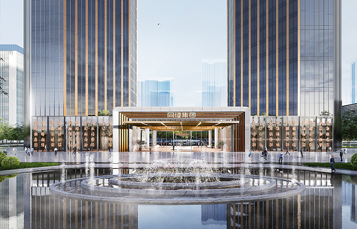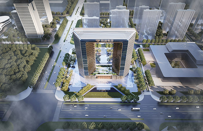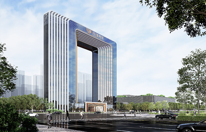 項目位于正定新區(qū)“四軸五心”的中央商務辦公區(qū)域內(nèi),隆興路商務軸北側(cè),由兩棟塔樓組成,功能為展廳、會議和辦公,總建筑面積5.8萬 m2,其中地上建筑面積4.2萬 m2。兩棟塔樓均為地下一層,地上21層,裙房2層,建筑高度100.85m,結(jié)構(gòu)高度86.700m。兩棟塔樓平面為八邊形,兩塔樓最近點距離約36.6m,最遠點距離約108.1m。建筑頂部設置八邊形造型和空中連廊與塔樓連為一體,“大道至簡,天下大同”,形成大底盤雙塔連體建筑。