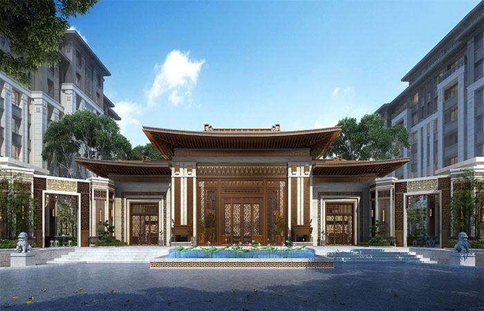 建筑立面整體風格以中式為主,為了濃縮中式傳統(tǒng)建筑精髓,彰顯地域特征,采用了中國古代建筑的形制、構(gòu)筑與符號,通過選材和構(gòu)造設計,彰顯中式建筑的美麗。建筑采用白色、駝色與淺灰作為整體主色調(diào),結(jié)合中式元素,整體效果恢弘大氣。