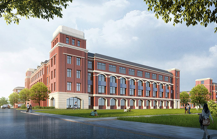 建筑外墻采用磚紅色與米白色相互碰撞映襯,形成典雅靈動(dòng)的視覺對(duì)比,以仿石漆、石材、Low-E中空玻璃為主要裝飾材料,突出建筑精工細(xì)作、開拓創(chuàng)新的工匠精神。