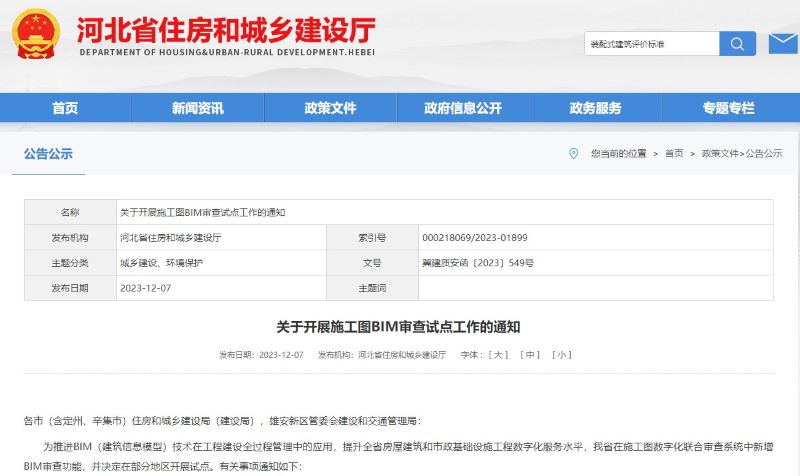 繼2023年12月7日河北省住房和城鄉(xiāng)建設(shè)廳發(fā)布《關(guān)于開展施工圖BIM審查試點工作》的通知,2024年3月13日石家莊市住房和城鄉(xiāng)建設(shè)局印發(fā)了《關(guān)于做好施工圖BIM審查十點工作的六項舉措》的通知,其中第一項舉措就提到了“自2024年4月1日起取得建筑工程規(guī)劃許可證的超高層建筑及政府投資公共建筑、城市綜合管廊、軌道交通項目須進行施工圖BIM審查,建設(shè)單位及勘察設(shè)計企業(yè)應(yīng)登錄河北省施工圖數(shù)字化聯(lián)合審查系統(tǒng)進行BIM 審查項目申報,并提交BIM 設(shè)計成果。”